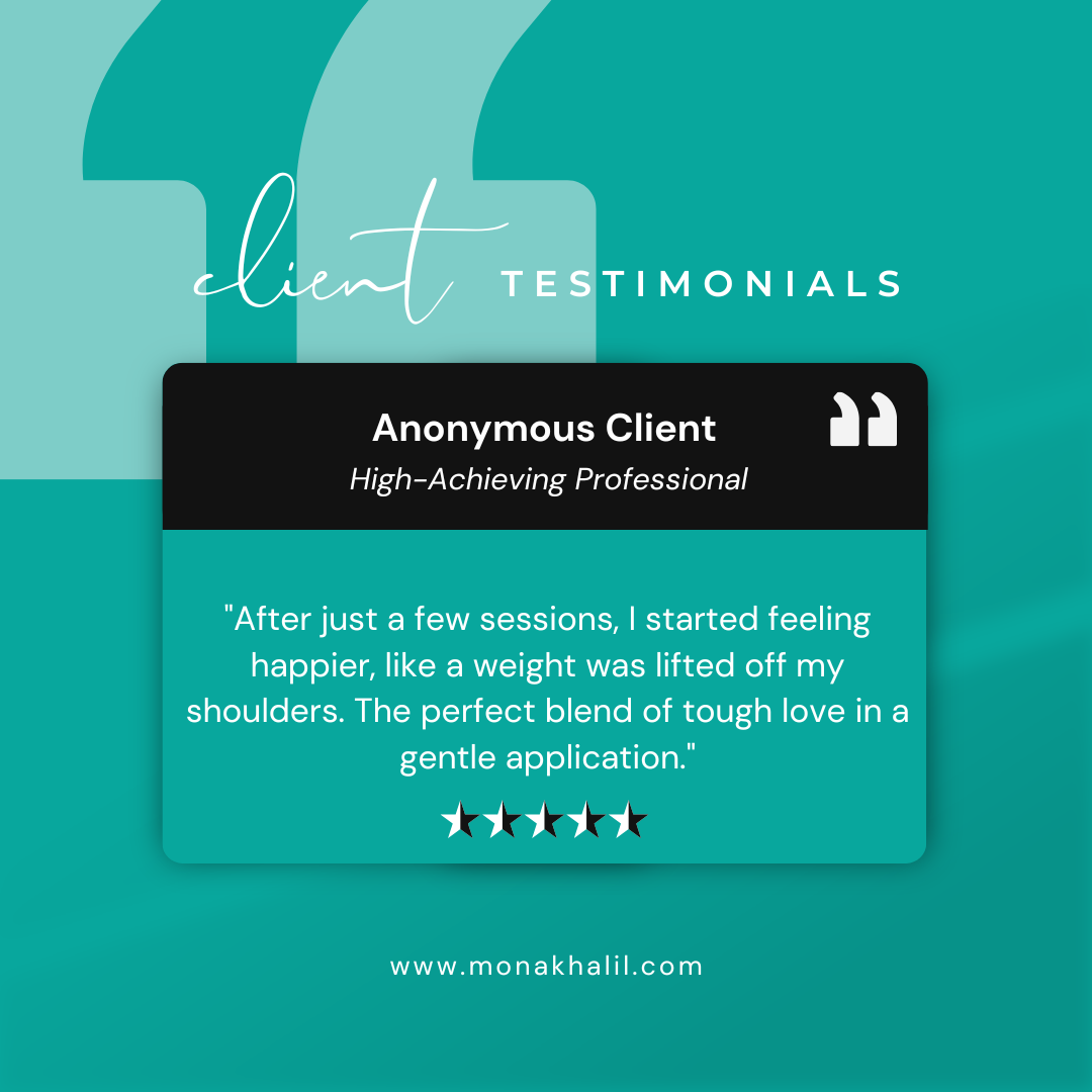 with real accountability and expert insight. After just a few sessions, I started feeling happier, like a weight was lifted off my shoulders. She helped me not only find new tools but also taught me how to apply tools I had previously learned to achieve my goals." — Anonymous Client