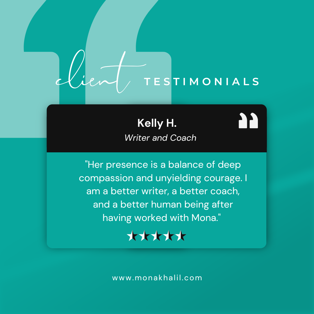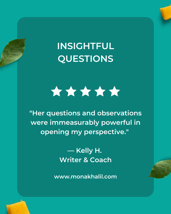 "Mona's unique strength as a coach is in her ability to hold enough space for the swirl of questions and feelings that arose as I explored my inner landscape, while also never losing sight of the core of our work. She is profoundly insightful, and her questions and observations were immeasurably powerful in opening my perspective and infusing old problems and patterns with a new sense of awareness and possibility. Her presence is a balance of deep compassion and unyielding courage, which was a source of modeling and inspiration as I worked on cultivating and trusting those qualities in myself. My free-range imagination and constant use of metaphor were consistently embraced as strengths by Mona, which allowed me to feel more acceptance and faith in my own capabilities. I am a better writer, a better coach, and a better human being after having worked with Mona."
