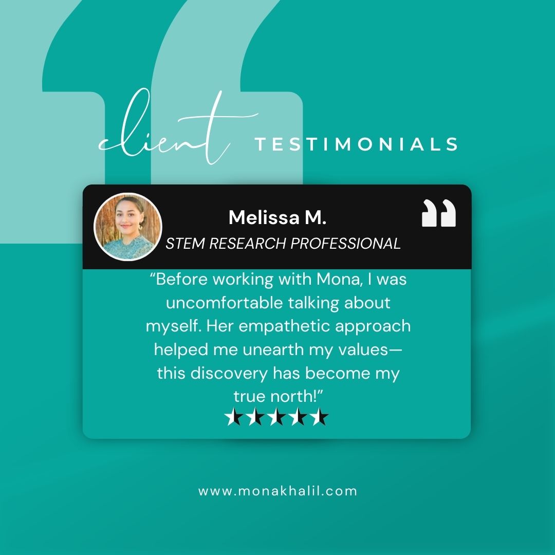 "Before starting my work with Mona, I was uncomfortable talking about myself. As a naturally introverted person and a middle child, I was not used to taking up much space. However, Mona's empathetic and insightful approach encouraged me to dig deeper, share more openly, and helped me unearth my values. This discovery has become my true north! I now empower others through my Latinas in STEM book research. Mona's guidance has been transformative, and I highly recommend her to anyone seeking personal and professional growth."